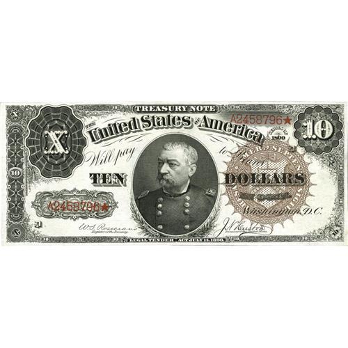 <B>Fr. 366 $10 1890 Treasury Note About New.</B></I> There exists a center bend that is not easily seen as well as a single corner tip bend. Overall, this piece appears fully Gem, with brilliant colors, broad margins, and perfectly printed devices.<BR><I>From The Plymouth Rock Collection</B></I>