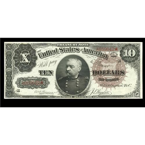 <B>Fr. 366 $10 1890 Treasury Note Gem New.</B></I> Fewer than a hundred examples of this number rare known, and very few of them could possibly equal this originally embossed, beautifully bright, perfectly printed General Sheridan Treasury Ten. The note is Superb in every sense save for the margins, which while more than adequate for Gem are just a hair shy of what we like to see for Superb. A piece of the highest quality.