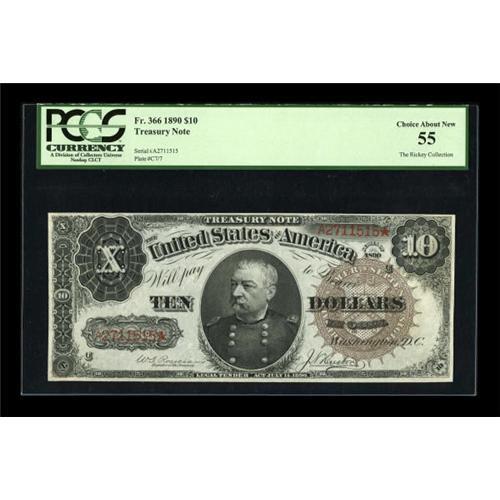 <B>Fr. 366 $10 1890 Treasury Note PCGS Choice About New 55.</B></I> The census count is right at 100 notes for this pleasing Sheridan. Seventy-five percent of all notes known are graded XF or less which leaves a scant population of higher grade examples for this elusive series. Pleasing color and average margins compose this bright note.<BR><BR><b>Shipping:</b> Coins & Currency (<a target="_blank" href="http://www.heritageauctions.com/common/shipping.php">view shipping information</a>)