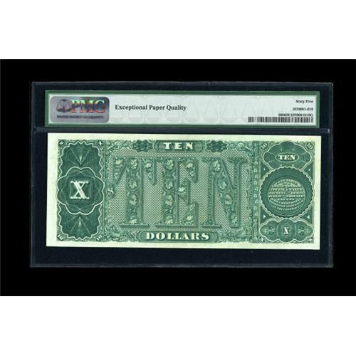 <B>Fr. 366 $10 1890 Treasury Note PMG Gem Uncirculated 65 EPQ.</B></I> Fewer than a hundred examples of this number are known, and very few of them could possibly equal this originally embossed, beautifully bright, perfectly printed General Sheridan Treasury Ten. The note is Superb in every sense save for the margins, which while more than adequate for Gem are just a hair shy of what we like to see for Superb. A piece of the highest quality which has earned the EPQ designation. <BR><I>From The Peter Gamble Collection.</B></I><BR><BR><b>Shipping:</b> Coins & Currency (<a target="_blank" href="http://www.heritageauctions.com/common/shipping.php">view shipping information</a>)