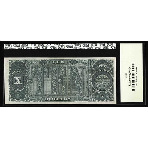 <B>Fr. 367 $10 1890 Treasury Note PCGS Gem New 66PPQ.</B></I> An absolutely gorgeous example of an 1890 Treasury Ten. The centering of both sides is terrific, the original embossing is pronounced across the entire surface of the note, not just on the seal and serial numbers, and the colors are the equal of the day the note was printed. Treasury Tens are truly scarce in this top grade and this striking example, with its large brown spiked seal, is sure to attract considerable bidder attention.