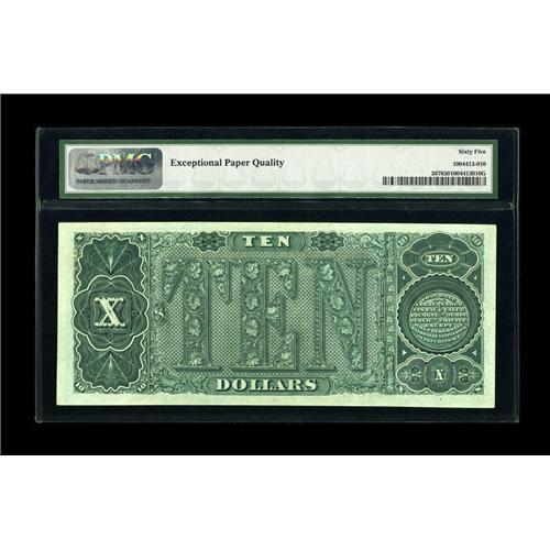<B>Fr. 367 $10 1890 Treasury Note PMG Gem Uncirculated 65 EPQ.</B></I> This rare note is right in the middle of the run of known CU specimens, but has never been offered or seen until now. The centering of both sides is terrific, the original embossing is pronounced across the entire surface of the note, not just on the seal and serial numbers, and the colors are the equal of the day the note was printed. Treasury Tens are truly scarce in this top grade and this striking example, with its large brown spiked seal, is sure to attract considerable bidder attention.<BR><BR><b>Shipping:</b> Coin/Currency (<a target="_blank" href="http://www.heritageauctions.com/common/shipping.php">view shipping information</a>)