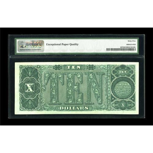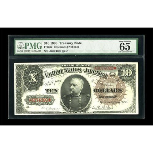 <B>Fr. 367 $10 1890 Treasury Note PMG Gem Uncirculated 65 EPQ.</B></I> We sold this beautiful note in January of 2007, where we commented "This rare note is right in the middle of the run of known CU specimens, but has never been offered or seen until now. The centering of both sides is terrific, the original embossing is pronounced across the entire surface of the note, not just on the seal and serial numbers, and the colors are the equal of the day the note was printed. Treasury Tens are truly scarce in this top grade and this striking example, with its large brown spiked seal, is sure to attract considerable bidder attention." At that sale it realized $25,300 against a pre-sale estimate of $20,000-up. PMG has only slabbed five Fr. 367's in all grades, grading only one other 65 and one 66. It would not surprise us at all to see this rare note exceed its January realization, perhaps by a considerable margin. <BR><BR><BR><b>Shipping:</b> Coins & Currency (<a target="_blank" href="http://www.heritageauctions.com/common/shipping.php">view shipping information</a>)