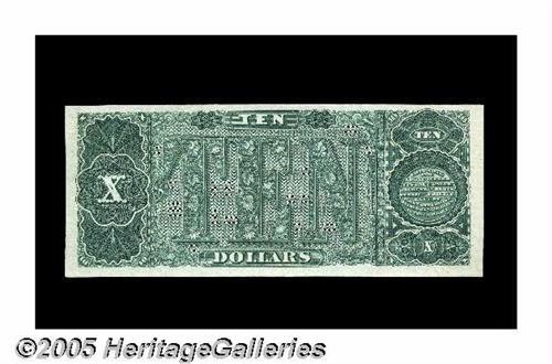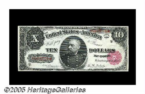 <B>Fr. 368 $10 1890 Treasury Note Gem New.</B></I> This is an outstanding example of its type, with broad, even margins, ideal centering and full flashy colors. The note also exhibits razor-sharp printing quality that gives a photographic sharpness to the handsome visage of General Philip H. Sheridan. To wrap up the package, this pretty Treasury Ten also has all its original embossing and perfect paper surfaces.