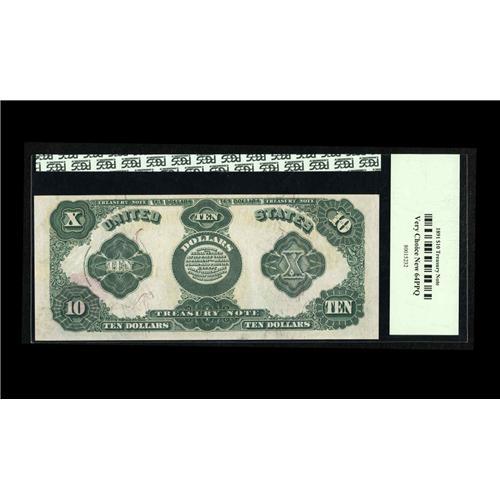 <B>Fr. 369 $10 1891 Treasury Note PCGS Very Choice New 64PPQ.</B></I> A highly attractive example, with original embossing that can be seen through the holder and a very bold red seal and serial numbers.