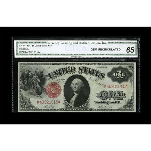 <B>Fr. 37 $1 1917 Legal Tender CGA Gem Uncirculated 65.</B></I> Embossing is viewed through the third-party holder.
