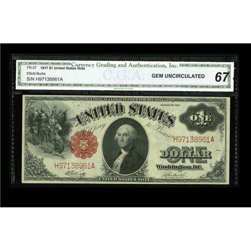 <B>Fr. 37 $1 1917 Legal Tender CGA Gem Uncirculated 67.</B></I> Nicely margined on all sides with deep color.