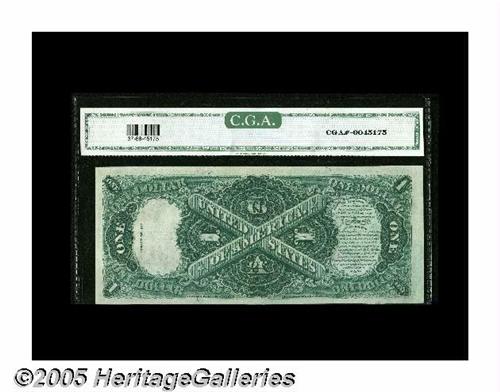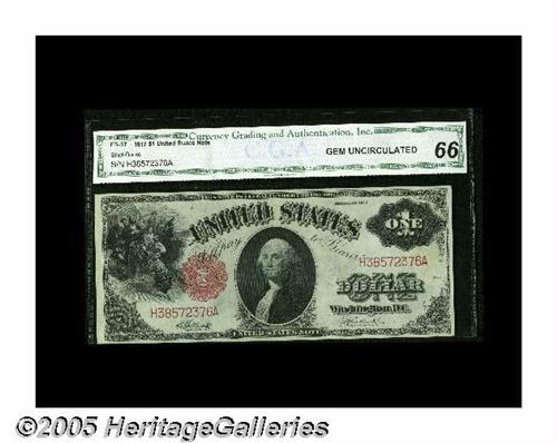 <B>Fr. 37 $1 1917 Legal Tender CGA Gem Uncirculated 66.</B></I> A broadly margined, brightly colored note with pronounced embossing that can be viewed through the third party holder.