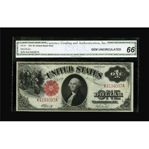 <B>Fr. 37 $1 1917 Legal Tender CGA Gem Uncirculated 66.</B></I> Wonderful margins are noticed on this well inked example.<BR><BR><b>Shipping:</b> Coins & Currency (<a target="_blank" href="http://www.heritageauctions.com/common/shipping.php">view shipping information</a>)