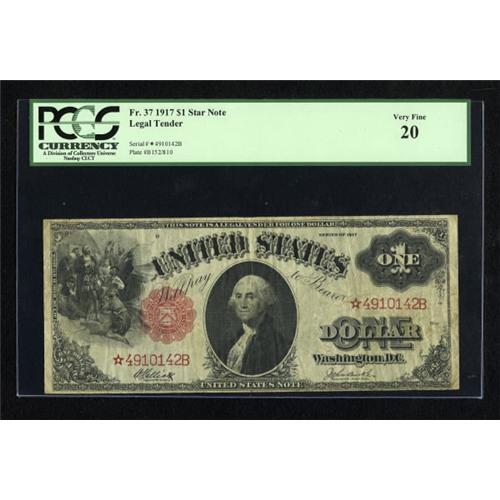 <B>Fr. 37 $1 1917 Legal Tender Star Note PCGS Very Fine 20.</B></I> The paper on this colorful star note is pleasing and completely problem free.<BR><BR><b>Shipping:</b> Coins & Currency (<a target="_blank" href="http://www.heritageauctions.com/common/shipping.php">view shipping information</a>)