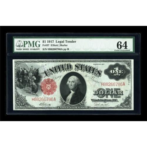 <B>Fr. 37 $1 1917 Legal Tender PMG Choice Uncirculated 64.</B></I> A nicer example with better margins than are seen for the grade.<BR><BR><b>Shipping:</b> Coins & Currency (<a target="_blank" href="http://www.heritageauctions.com/common/shipping.php">view shipping information</a>)