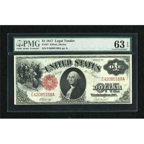 <B>Fr. 37 $1 1917 Legal Tender PMG Choice Uncirculated 63 EPQ.</B></I> Gem sized margins are noted on three sides of this perfectly original piece.<BR><I>From The Warren Marshall Collection</B></I><BR><BR><b>Shipping:</b> Coins & Currency (<a target="_blank" href="http://www.heritageauctions.com/common/shipping.php">view shipping information</a>)