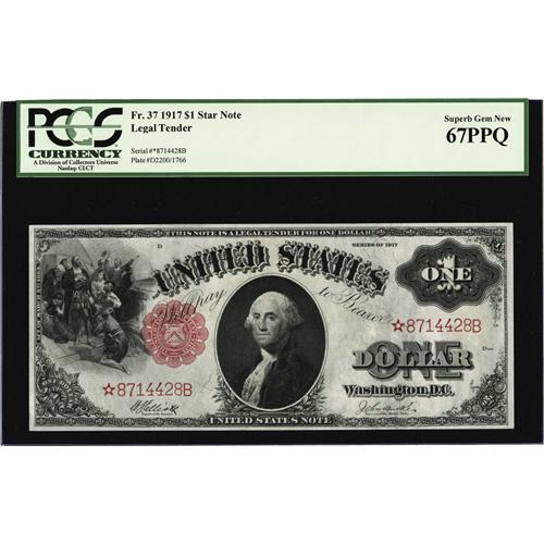 <B>Fr. 37 $1 1917 Legal Tender Star Note PCGS Superb Gem New 67PPQ.</B></I> In our first offering of this note, we described it, "A broadly margined, pristine Star note with deep, original embossing, flashy, bright colors and broad, even margins far beyond what we're used to seeing for these normally closely margined 1917 Ones. Not a rare Star, with 116 pieces listed in the Murray reference, but not very many of them could possibly be as nice as this beauty." The third party that provided the grade here was in full agreement with our opinion of Superb Gem New.<BR><I>From The Jeffrey L. Olyan Collection, Part 1</B></I>