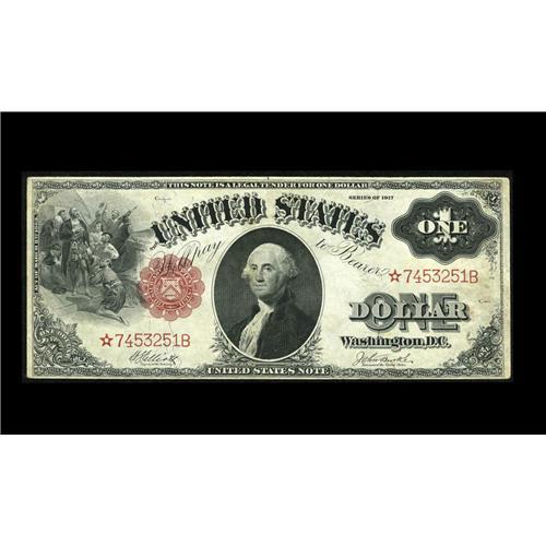 <B>Fr. 37 $1 1917 Legal Tender Star Note Extremely Fine-About New.</B></I> While all initial impressions are that it is New, closer scrutiny does reveal two well hidden folds, along with a tiny repaired tear at upper left.