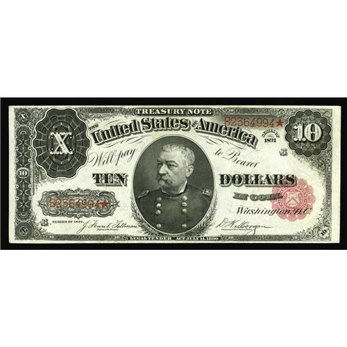 <B>Fr. 370 $10 1891 Treasury Note Choice New.</B></I> This Open Back Sheridan truly is quite nice. The surfaces of the note are pleasing, although the corners show some softness. A fairly scarce piece which has been off the market for many years.