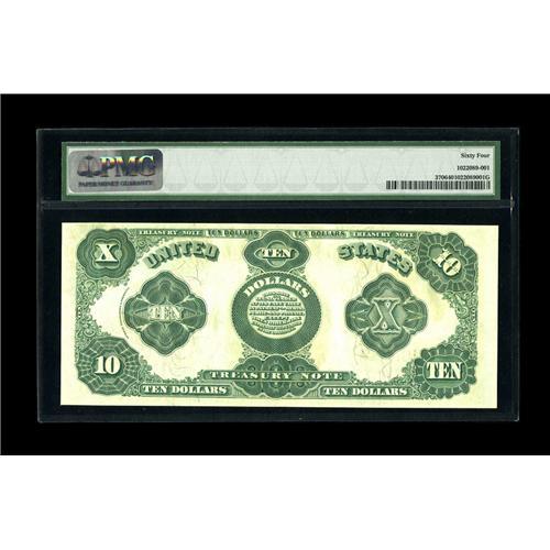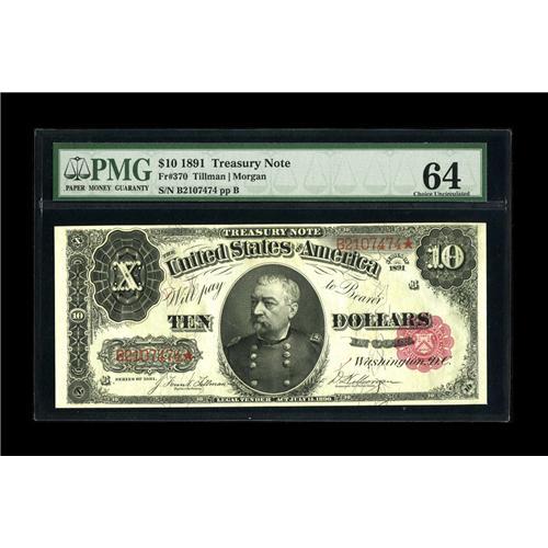 <B>Fr. 370 $10 1891 Treasury Note PMG Choice Uncirculated 64.</B></I> Among the scarcer type notes in Gem grades, this $10 Sheridan Treasury barely misses. The centering is decent, the colors rich and the eye appeal is there. A very nice Open Back Sheridan that will be welcomed.<BR><BR><b>Shipping:</b> Coin/Currency (<a target="_blank" href="http://www.heritageauctions.com/common/shipping.php">view shipping information</a>)