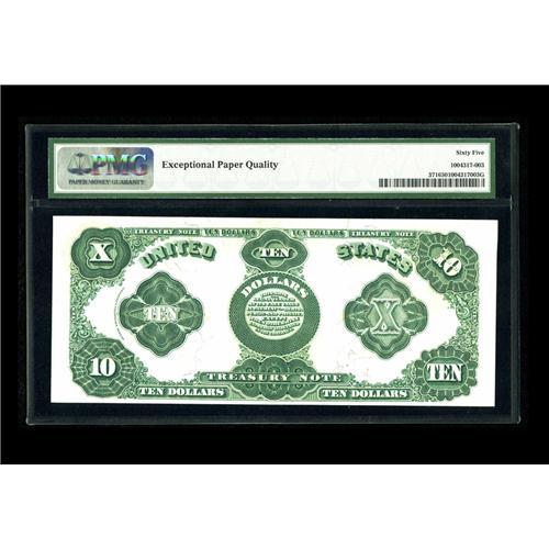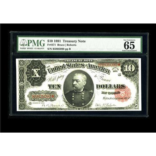 <B>Fr. 371 $10 1891 Treasury Note PMG Gem Uncirculated 65 EPQ.</B></I> This note previously appeared in one of our auctions and was described, "With this being one of only six examples that has avoided circulation, we expect to see fierce competition this evening to acquire this Gem. The paper is quite bright with excellent hues and the margins are adequate though the back centering could be a touch better."<BR><BR><b>Shipping:</b> Coin/Currency (<a target="_blank" href="http://www.heritageauctions.com/common/shipping.php">view shipping information</a>)