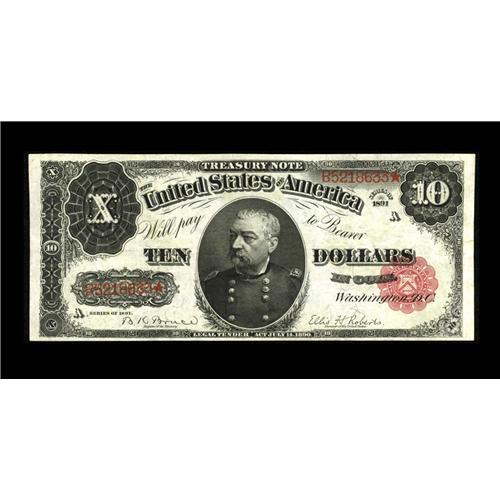 <B>Fr. 371 $10 1891 Treasury Note Very Fine.</B></I> This note was last sold in 1983 in a Hickman and Oakes sale. They called the note About VF, which is the grade it retains in the census. We disagree with the grade as it is a solid VF. The paper quality is excellent, the margins are sufficient and the color is bold and bright in all the right places. If ever there was a piece that is ideal for a grading set, this is it. To date, only forty three examples of this issue are known extant.<BR><I>From The Bill and Kathy Stella Currency Collection</B></I><BR><BR><b>Shipping:</b> Coin/Currency (<a target="_blank" href="http://www.heritageauctions.com/common/shipping.php">view shipping information</a>)