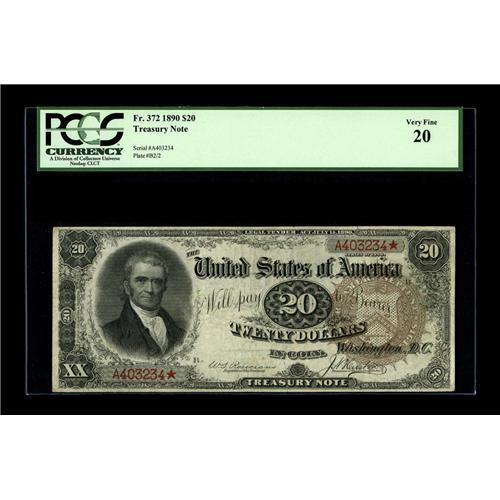 <B>Fr. 372 $20 1890 Treasury Note PCGS Very Fine 20.</B></I> Just about sixty examples are known of this Large Brown Seal 1890 Treasury Twenty. This mid-grade example has a touch of soil here and there, but has held onto the appeal of a somewhat higher grade piece.<BR><BR><b>Shipping:</b> Coin/Currency (<a target="_blank" href="http://www.heritageauctions.com/common/shipping.php">view shipping information</a>)
