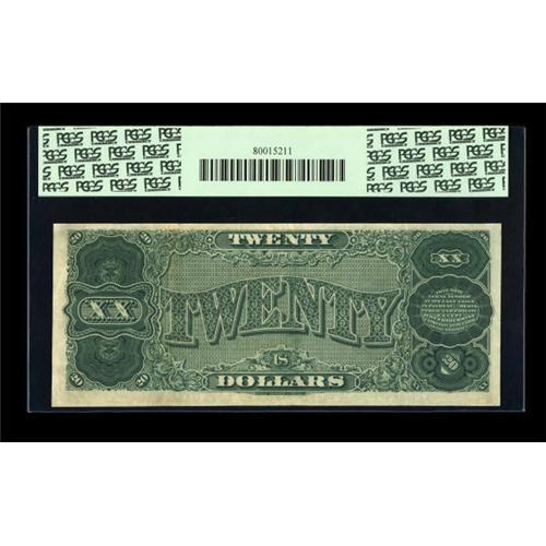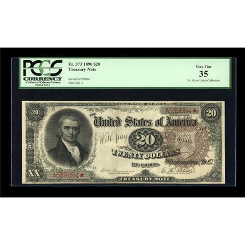<B>Fr. 373 $20 1890 Treasury Note PCGS Very Fine 35.</B></I> Only ten $20 Treasury Notes are known with this Brown Seal Rosecrans-Nebeker signature combination. This piece, which is listed in the census as EF, is consecutive to the only other EF in the census. They are identical in condition in every way and are thus tied for the two finest pieces available for this scarce number. In 2006, the other note realized $36,800 after some very spirited bidding. The eye appeal is certainly sufficient for a full EF grade, and the printed details remain perfectly bright.<BR><BR><b>Shipping:</b> Coins & Currency (<a target="_blank" href="http://www.heritageauctions.com/common/shipping.php">view shipping information</a>)
