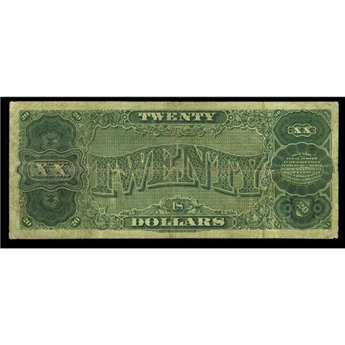 <B>Fr. 374 $20 1890 Treasury Note Fine.</B></I> Off the market since a 1969 Paramount sale. It's solid for the grade, with good margins and excellent color. Twenty Dollar Treasury Notes are scarce in all grades, and this evenly circulated example should prove to be quite a popular lot. The note has two pinholes and some minor edge notches near the corners, but it is otherwise defect-free for the grade.