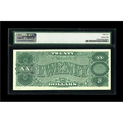 <B>Fr. 374 $20 1890 Treasury Note PMG About Uncirculated 55.</B></I> An absolute beauty, with broad margins, terrific centering of both sides and tons of eye appeal. This note has never been on the market before and falls within the run of known new notes. While not fully uncirculated, diligent searching by trained eyes is required to find the reason that this flawless-appearing beauty grades less than Choice New. Very close inspection will reveal a ghost of a fold. A truly beautiful example of an always-very-popular type. Rare indeed is the opportunity to offer two beautiful high grade examples in one auction.<BR><BR><b>Shipping:</b> Coin/Currency (<a target="_blank" href="http://www.heritageauctions.com/common/shipping.php">view shipping information</a>)