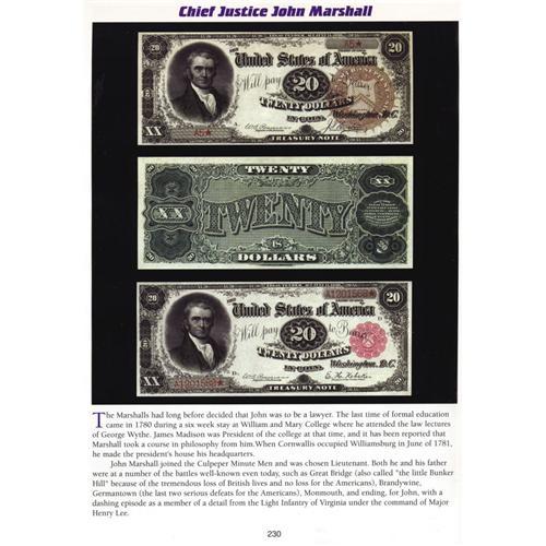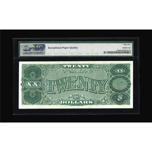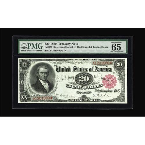 <B>Fr. 374 $20 1890 Treasury Note PMG Gem Uncirculated 65 EPQ.</B></I> A run of about twenty uncirculated examples are known of this number, and those are just about the only uncs. This piece is part of that run, but it has been known to collectors far longer than its serial-number neighbors. It was part of the Grinnell Collection, and sold by Barney Bluestone in the first Grinnell sale on November 25, 1944. After that, the note became part of the Robert F. Schermerhorn Collection. We've handled a number of pieces from this short run, and this is as nice as any of them... and nicer than most. Once the EPQ designation is assigned, centering becomes the limiting factor of the grade, and in this case, the centering is plenty good enough for Gem but short of Superb. The note has magnificent color, ideal back centering and apparently perfect original paper surfaces, as that is what we believe EPQ designates. 1890 Treasury Twenties, while not rare when all grades are considered, are certainly rare, and will remain forever so, in 65 EPQ holders. The note is pictured on page 230 of the Dauers' book, along with a short biography of John Marshall. Marshall was one of the most influential Chief Justices of the Supreme Court.<BR><I>From The Dr. Edward and Joanne Dauer Collection</B></I>