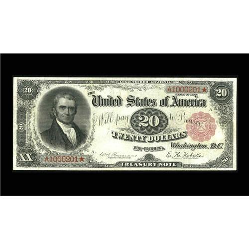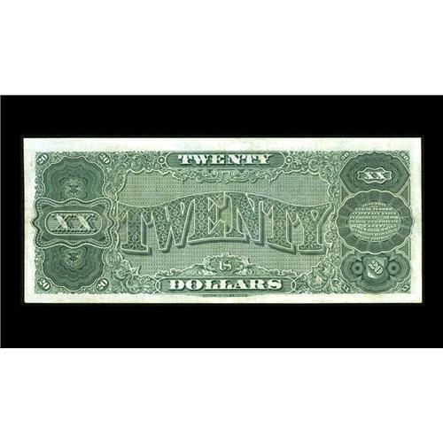 <B>Fr. 374 $20 1890 Treasury Note Very Fine.</B></I> This 1890 Treasury Twenty has only one previous market appearance, which was at a Lyn Knight sale six years ago. The note is very nicely centered on both sides and has retained decent eye appeal in spite of a number of small, rather well done repairs. The most obvious of the repairs is a small plugged hole in the top margin completely outside the design area. While the note will probably fall short of full VF bid, it should easily realize in excess of...<BR><I>From The Ross Bailey Collection</B></I>