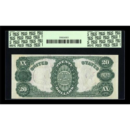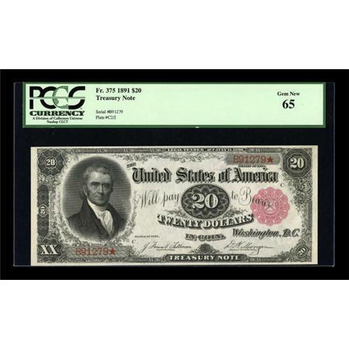 <B>Fr. 375 $20 1891 Treasury Note PCGS Gem New 65.</B></I> A very attractive piece from the run that has supplied collectors with Uncirculated examples of this scarce and popular type. The colors are excellent, and the margins are more than acceptable for the Gem grade level. This type had been unavailable in high grade until a decade ago, when a small group of Uncirculated notes unexpectedly appeared. John Marshall, whose portrait appears on this note, served as Chief Justice of the Supreme Court. He died in 1835. The portrait on the note was engraved by Charles Schlecht, from an oil done by Harry Inman. <BR><BR><b>Shipping:</b> Coins & Currency (<a target="_blank" href="http://www.heritageauctions.com/common/shipping.php">view shipping information</a>)