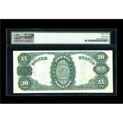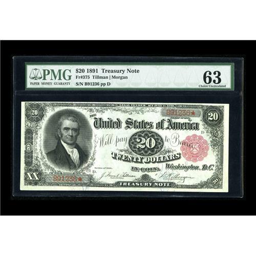 <B>Fr. 375 $20 1891 Treasury Note PMG Choice Uncirculated 63.</B></I> Off the market for over ten years, this pretty note is from near the beginning of that run, and it's one of the more eye appealing pieces, with excellent color and sharp print quality. The top margin is just a bit tight. John Marshall, whose portrait appears on this note, served as Chief Justice of the Supreme Court. He died in 1835. The portrait was engraved by Charles Schlecht, from a painting done by Harry Inman.<BR><BR><b>Shipping:</b> Coin/Currency (<a target="_blank" href="http://www.heritageauctions.com/common/shipping.php">view shipping information</a>)