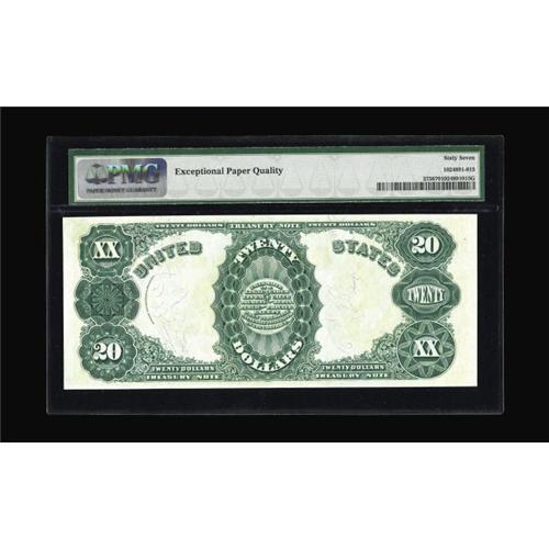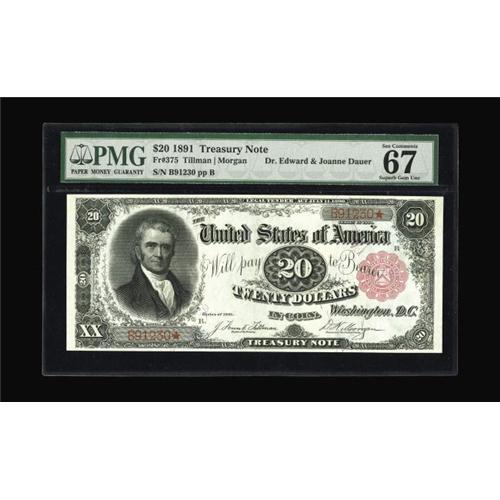 <B>Fr. 375 $20 1891 Treasury Note PMG Superb Gem Unc 67 EPQ.</B></I> Only two notes in the Dauer Treasury Note and Gold Certificate Collections reached the 67 EPQ level, and both of those notes were Treasury Twenties. This Open Back 1891 type is very rare in uncirculated condition, with a few odd pieces plus one run supplying all of the known uncs. This note is from that run. A photograph of both sides can be found on page 231 of the Dauer book. Currently, the Green Sheet does not price any type of currency above the Superb 67 grade. The Sheet makes no allowance for EPQ or its PPQ equivalent. We've seen most of the known uncirculated Fr. 375's, and if we understand the standards correctly, few if any have rated the premium-or-exceptional paper-quality grades. We would not be surprised if this EPQ note stood with very few others for decades to come.<BR><I>From The Dr. Edward and Joanne Dauer Collection</B></I>