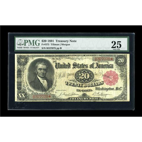 <B>Fr. 375 $20 1891 Treasury Note PMG Very Fine 25.</B></I> Good paper originality, and better color than one would expect for the grade, highlight this 1891 $20 Treasury.<BR><BR><b>Shipping:</b> Coins & Currency (<a target="_blank" href="http://www.heritageauctions.com/common/shipping.php">view shipping information</a>)