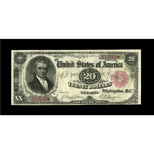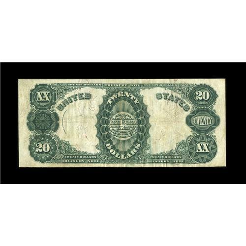 <B>Fr. 375 $20 1891 Treasury Note Very Fine.</B></I> A nice circulated example of this scarce type, with good color and quite a handsome appearance. Mid-grade examples of this scarce type are rather hard to come by. CAA has handled almost 30 Fr. 375's in our many sales, with only seven of them grading Fine or Very Fine. Most survivors of this number are in high grade and very expensive, or wretched and barely collectible. Not so for this piece. It's a very respectable example that will be a highlight of any circulated type set. A slight paper skin is noticed on the back.<BR><BR><b>Shipping:</b> Coin/Currency (<a target="_blank" href="http://www.heritageauctions.com/common/shipping.php">view shipping information</a>)