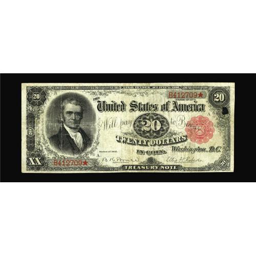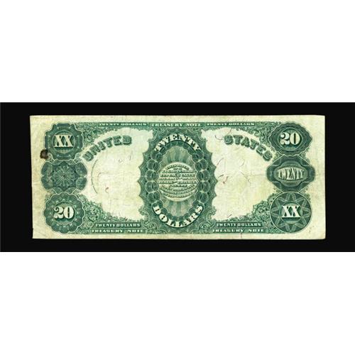 <B>Fr. 375a $20 1891 Treasury Note Fine.</B></I> Only two Fr. 375a's are known to exist, this piece and a high grade example forever off the market in the Smithsonian Institution. This note has seen a good deal of honest circulation, and has picked up a small ink stain at the right, but remains otherwise problem free for the grade. CAA has never had the pleasure of handling this great rarity before, and, after tonight, we will likely not see it again for decades. The note has resided in the great collections of Harley Freeman and Amon Carter...in between it was handled by the legendary Ft. Worth dealer B.Max Mehl in 1953. In recent years the note has struggled to find a permanent home, and has been handled by a number of first tier dealers. We are quite sure that after tonight it will be in the collection where it will reside for years to come. We would be hard pressed to guess which one that will be, but we know of several good homes that are ready, willing and able to put this piece in the type of collection where it belongs....good luck to all.