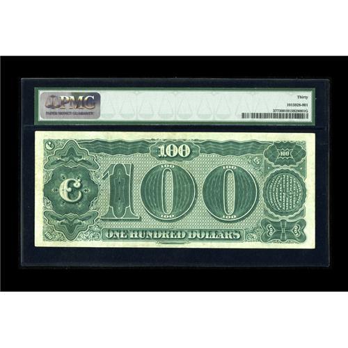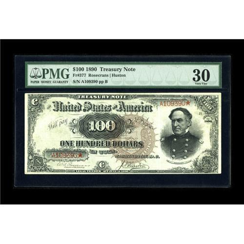 <B>Fr. 377 $100 1890 Treasury Note PMG Very Fine 30.</B></I> This Watermelon Hundred is one of fewer than three dozen examples of its type in existence, and one of fewer than two dozen that have ever appeared on the market. Eight pieces are permanently in government hands, and several others are known by serial number only, having never reached the numismatic marketplace. The back, from which the nickname of this note is derived, is beautifully clean, and the "Watermelon" effect of the large zeros remains pronounced, as the ink quality is razor sharp. This piece is beautifully margined, with the only place even questionably close being the lower right of the face where the margin approaches but does not touch the frameline. With the current tremendous emphasis on paper money collecting, it is a shame that only two dozen collectors are in the exclusive group that may possess this stately type.<BR><BR><b>Shipping:</b> Coins & Currency (<a target="_blank" href="http://www.heritageauctions.com/common/shipping.php">view shipping information</a>)