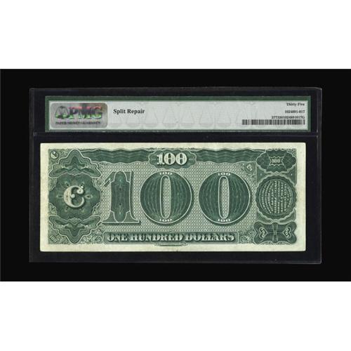 <B>Fr. 377 $100 1890 Treasury Note PMG Very Fine 35.</B></I> When Treasury Department engravers set out to produce the designs for the soon-to-be-issued 1890 Treasury Notes, little did they think the back designs for the $100 and $1000 denominations were to be among the most recognized by currency collectors today. The skillfully executed designs by W.A. Copenhaver, W.H. Dougal, G.U. Rose Jr. and J.A. Rueff included oversized zeros that featured textured-appearing ripples reminiscent of watermelon skin. Today, the notes are simply referred to as the "Watermelon," and "Grand Watermelon." The $100 Treasury Note was printed starting in late 1890; total production was only 120,000 notes. The near exclusive use of these notes in large-denomination transactions led to a heavy redemption rate. Today, extant examples number less than three dozen. This number is misleading when looked at closely, as eight of the surviving examples will forever be held in institutional collections; the majority of the rest are held by collectors that acquired them a decade or more ago. Once any collector gets his hands on a Watermelon Note, its reappearance on the market will typically only come in an estate sale. This note has been off the market for over a quarter of a century since it last appeared in a New England Rare Coin Auctions sale. The note is somewhat optimistically listed as "Extremely Fine" in Martin Gengerke's United States Paper Money Records, but it certainly does carry that appearance. The PMG grade of Choice Very Fine seems right on the money to us. The note does have a small well-repaired margin split at the top, which PMG has noted on the holder as, "Split Repair." It's a well margined piece, with terrific color on both sides. One of the classic pieces in the Dauer Collection, the note appears (plated on both sides) on page 236 of their book.<BR><I>From The Dr. Edward and Joanne Dauer Collection</B></I>