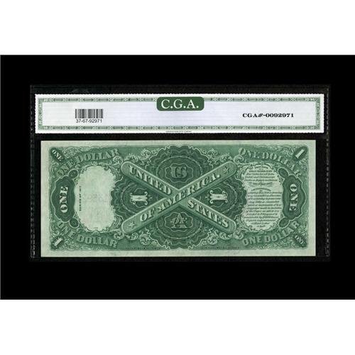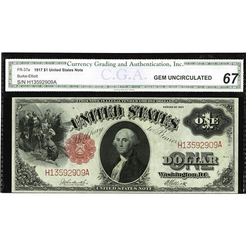 <B>Fr. 37a $1 1917 Legal Tender CGA Gem Uncirculated 67.</B></I> A very rare note with the Elliott and Burke signatures reversed. A printing plate was engraved (face plate 1519) with the signatures reversed and notes were printed before the mistake was discovered. The note is well margined and very bright with penetrating embossing. One of the nicest of this variety we have seen.