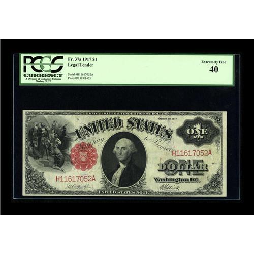 <B>Fr. 37a $1 1917 Legal Tender Burke-Elliott Error Note PCGS Extremely Fine 40.</B></I> Three light folds are detected upon close inspection. A very rare note with the Elliott and Burke signatures reversed. A printing plate was engraved (face plate 1519) with the signatures reversed and notes were printed before the mistake was discovered.<BR><BR><b>Shipping:</b> Coin/Currency (<a target="_blank" href="http://www.heritageauctions.com/common/shipping.php">view shipping information</a>)