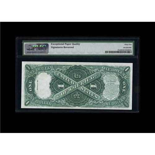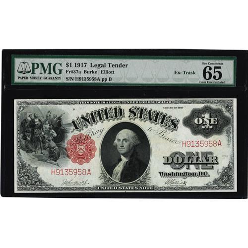 <B>Fr. 37a $1 1917 Legal Tender PMG Gem Uncirculated 65 EPQ.</B></I> From our sale of the Malcolm Trask Collection where it was described, "Unbelievably fresh, with deep original embossing, broad margins, perfect centering of both sides and 100% full, flashy color. As nice an example of this transposed-signature variety as we have ever handled. Fewer than 100 are known, as compared to over 700 Fr. 37's. While this note has been locked away in the Trask collection for nearly sixty years, we sold the "A" position note from this same sheet in January of 2001 for $1760. We would expect this beauty to easily reach and possibly surpass that level."<BR><I>From The Jeffrey L. Olyan Collection, Part 1</B></I>