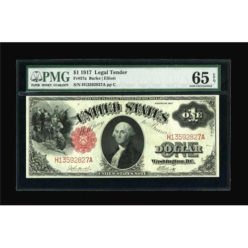 <B>Fr. 37a $1 1917 Legal Tender PMG Gem Uncirculated 65 EPQ.</B></I> As nice an example of this transposed-signature variety as we have ever handled. Fewer than 100 are known, as compared to over 700 Fr. 37's. The last example sold by us in this grade realized $3450.<B><BR></B></I><I>From The John Ameen Collection</B></I><BR><BR><b>Shipping:</b> Coins & Currency (<a target="_blank" href="http://www.heritageauctions.com/common/shipping.php">view shipping information</a>)