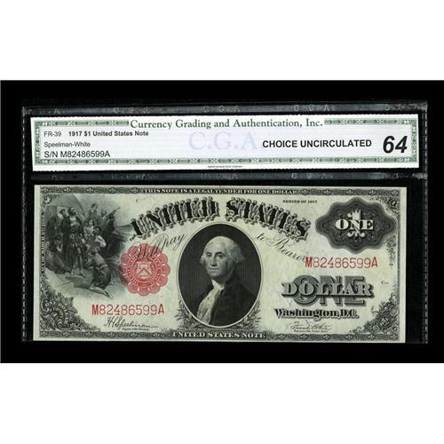 <B>Fr. 39 $1 1917 Legal Tender CGA Choice Uncirculated 64.</B></I> The corners are sharp and the colors are bright.<BR><BR><b>Shipping:</b> Coin/Currency (<a target="_blank" href="http://www.heritageauctions.com/common/shipping.php">view shipping information</a>)