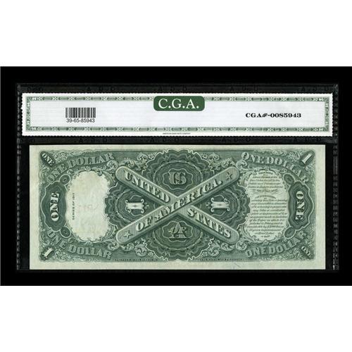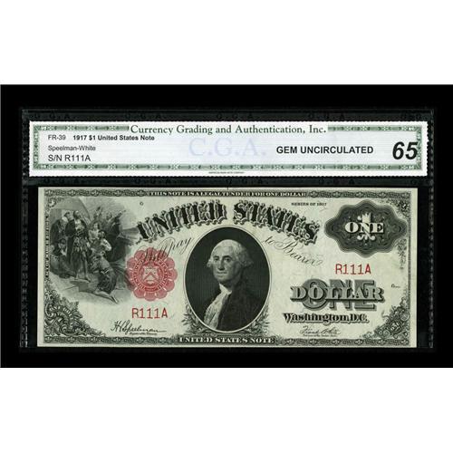 <B>Fr. 39 $1 1917 Mule Legal Tender CGA Gem Uncirculated 65.</B></I> In addition to grade, this brightly colored note boasts the solid, three digit serial number R111A.