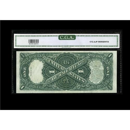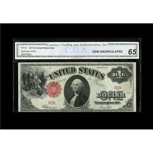 <B>Fr. 39 $1 1917 Legal Tender CGA Gem Uncirculated 65.</B></I> Serial Number R2A adorns this embossed Ace that exhibits nice color and bright paper. The bottom margin runs along the frame line on this otherwise captivating note.