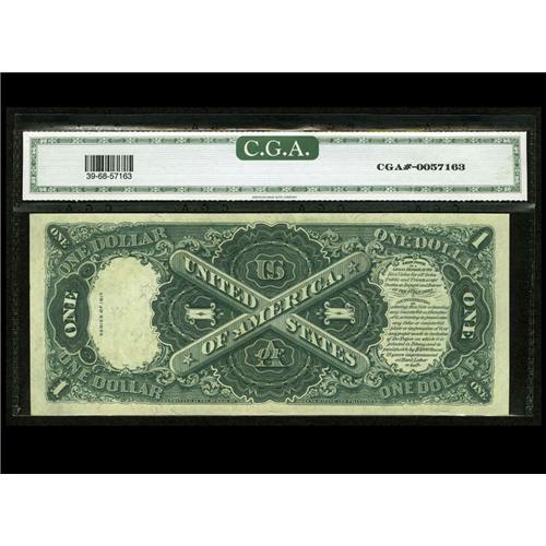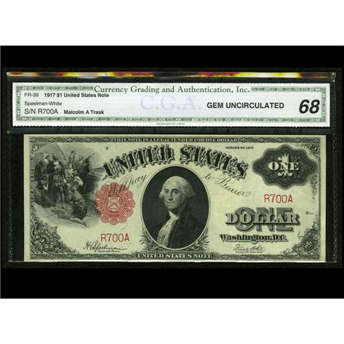 <B>Fr. 39 $1 1917 Legal Tender CGA Gem Uncirculated 68.</B></I> From our sale last January of the Malcolm Trask Collection where it was described: "Incredibly well margined for the issue, with absolutely perfect centering of both sides, brilliant colors, deep original embossing, pristine surfaces and the round three-digit serial number 700. This note, like so many others from the Trask collection, is of the quality that is almost never seen on today's market. The number of years that passed between the printing of this note and its capture by Malcolm Trask was considerably shorter than the period of time it remained in the collection. Pristine!