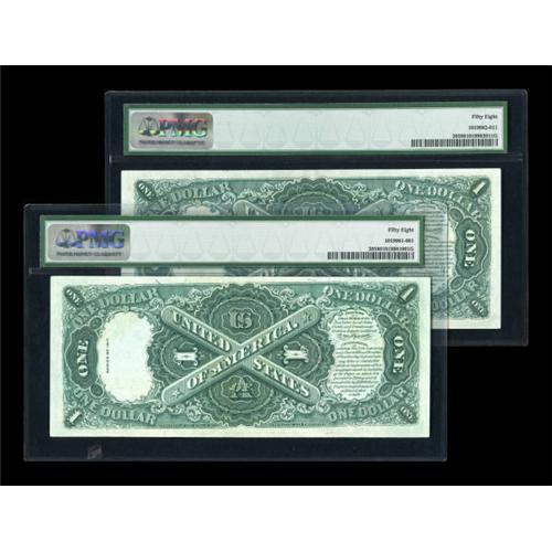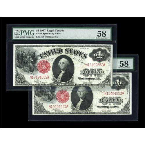 <B>Fr. 39 $1 1917 Legal Tender Consecutive Pair PMG Choice About Unc 58.</B></I> Both of the notes have fresh, bright color. The reason for the AU grade is not apparent through the holders, but we are confident that these two bright notes share a center fold.<BR><BR><b>Shipping:</b> Coins & Currency (<a target="_blank" href="http://www.heritageauctions.com/common/shipping.php">view shipping information</a>)