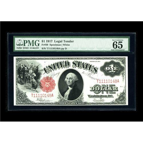 <B>Fr. 39 $1 1917 Legal Tender PMG Gem Uncirculated 65 EPQ.</B></I> We are particularly pleased with the paper quality on this note. Not even a trace of handling is noted and the colors are exceptional.<BR><BR><b>Shipping:</b> Coin/Currency (<a target="_blank" href="http://www.heritageauctions.com/common/shipping.php">view shipping information</a>)