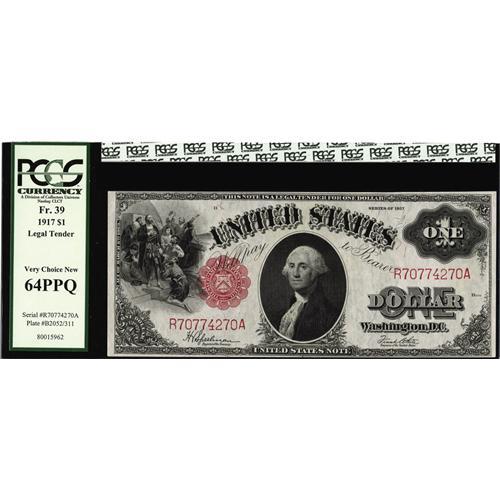 <B>Fr. 39 $1 1917 Legal Tender PCGS Very Choice New 64PPQ.</B></I> The margins are bit uneven on this well embossed red seal.
