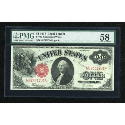 <B>Fr. 39 $1 1917 Legal Tender PMG Choice About Unc 58.</B></I> Bright white paper and dark inks are merits of this Ace that has a non-aligned suffix letter in the serial number. <BR><BR><b>Shipping:</b> Coins & Currency (<a target="_blank" href="http://www.heritageauctions.com/common/shipping.php">view shipping information</a>)