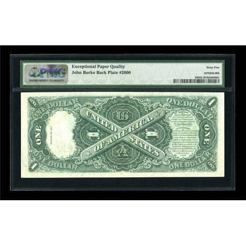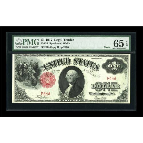 <B>Fr. 39 $1 1917 Mule Legal Tender PMG Gem Uncirculated 65 EPQ.</B></I> Double digit repeating serial number R44A is seen on this gorgeous gem that offers cavernous embossing.<B><BR></B></I><I>From The John Ameen Collection</B></I><BR><BR><b>Shipping:</b> Coins & Currency (<a target="_blank" href="http://www.heritageauctions.com/common/shipping.php">view shipping information</a>)