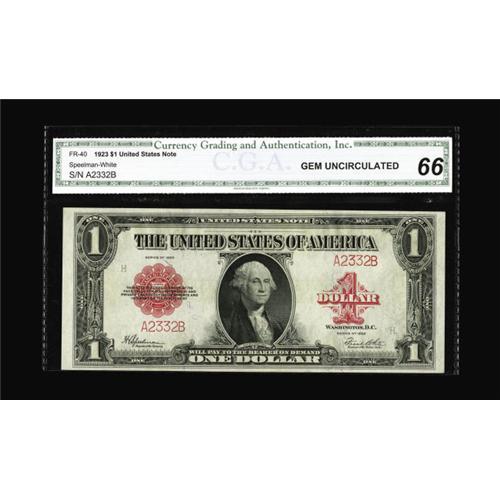<B>Fr. 40 $1 1923 Legal Tender CGA Gem Uncirculated 66.</B></I> Serial number A2332B comes with this flashy Ace that has natural paper surfaces.